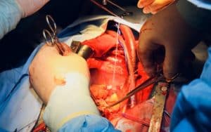 Blood flow in the aorta is stopped with clamp, and the donor heart is cooled with cardioplegic solution during removal. Surrounding blood vessels are preserved.Â