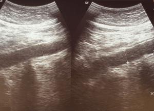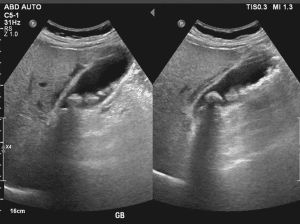 Sonographic Murphy’s Sign: Press with the transducer on the abdomen to determine whether there is tenderness in the gall bladder area to indicate cholecystitis.Â