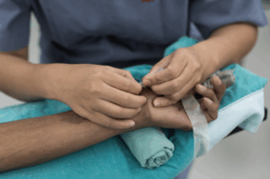 when motion is not detected, the second hand is touched to the palpate the radius artery about 1-2 cm away from the wrist. Afterward, the needle will penetrate the skin at a 30- to 45-degree angle searching for a short and clear blood return. To identify the right vessel, appropriate brightness and synchronous pulsations of the blood should be seen. Once you have the flash budge a little further and go up with the thrust of the sword. At this stage, the clinician can now press the tip of the wire to about ten degrees to lead it directly into the vessels.