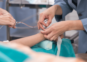 For the procedure define clear indications, make sure no contraindications exist and obtain either patient’s consent or that of a healthcare proxy. They get materials, set the transducer, perform a pause, and run Allen test. Place the patient comfortably, with their arm parallel to the ground, with the forearm supinated and the wrist dorsiflexed. Set up the sterile field, tools and insertion site, ensuring that the patient is checked on preoperatively.Â