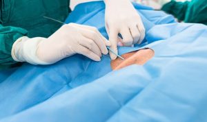 Create a 5-mm incision midway between the nipple and humeral head, using an artery clip for 3-4 cm dilatation.