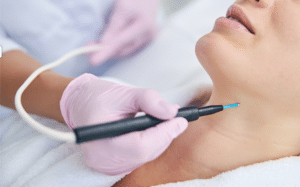 Step 3: For small and superficial lesions, a fine needle electrode tip is used while for larger lesions, a ballpoint electrode tip is used.