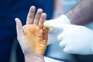 The skin is carefully retracted to expose the underlying palmar fascia.