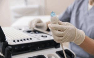 Step 2: Probe Choice and selection: For the examination of veins such as IJV a 7.5-10 MHz linear transducer is preferred while a curvilinear transducer is best suited for femoral or subclavian veins. Apply sterile gel and put on a sterile sheath that assists in developing an aseptic plane around the placed probe.