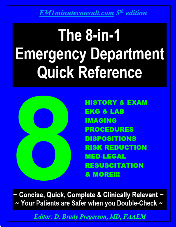 Dr. Pregerson is an emergency physician in San Diego. He is the author of the Emergency Medicine 1-Minute Consult, the 8-in-1 Emergency Department Quick Reference, and the A-to-Z Emergency Pharmacopoeia & Antibiotic Guide. Click a book title above or one of the images below to learn more. .