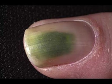 Pseudomonas aeruginosa infection of the nail plate, exposed to soaps and detergents, is subjected to mechanical damage, particularly in the elderly. Green or black nails highlight the possibility of Pseudomonas infection and is treated with an oral quinolone, especially in older adults.