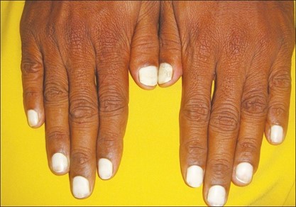 Leukonychia totalis is a clinical manifestation of hypoalbuminemia, which can occur in nephrotic syndrome, protein malabsorption, and protein-losing enteropathies. This disorder is characterized by whitening the entire nail and is most likely to affect all nails.