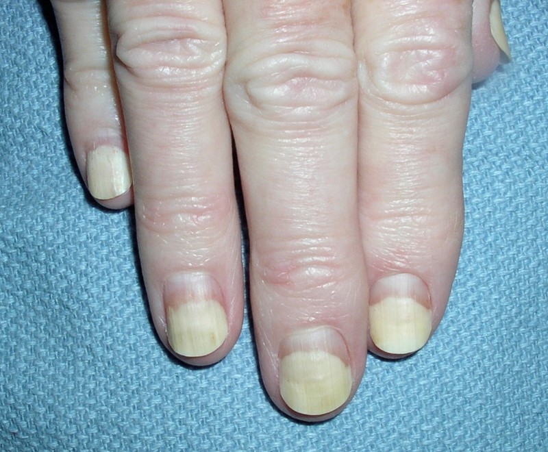 Yellow nail syndrome causes nails to lose their cuticle and separate from the nail bed in certain areas. It is frequently associated with respiratory diseases such as chronic bronchitis. Arm swelling can also be associated with yellow nail syndrome.