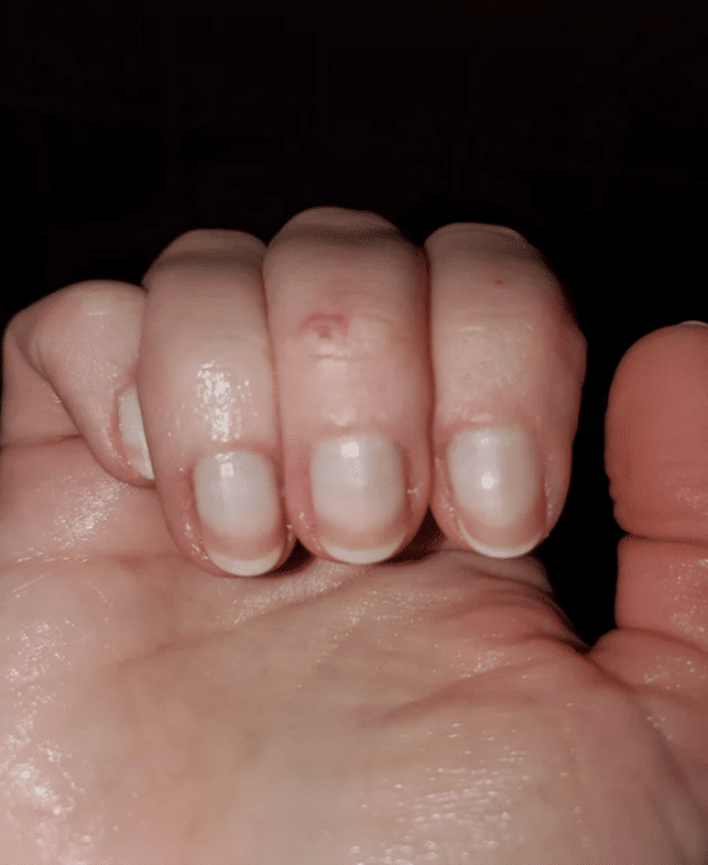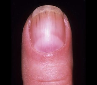 Splinter hemorrhages are small blood spots that develop beneath the nail. They resemble splinters caused by microscopic blood vessels or capillaries along the nail bed being injured and ruptured. The bleeding causes a splinter-like line to form in the direction of the nail development.