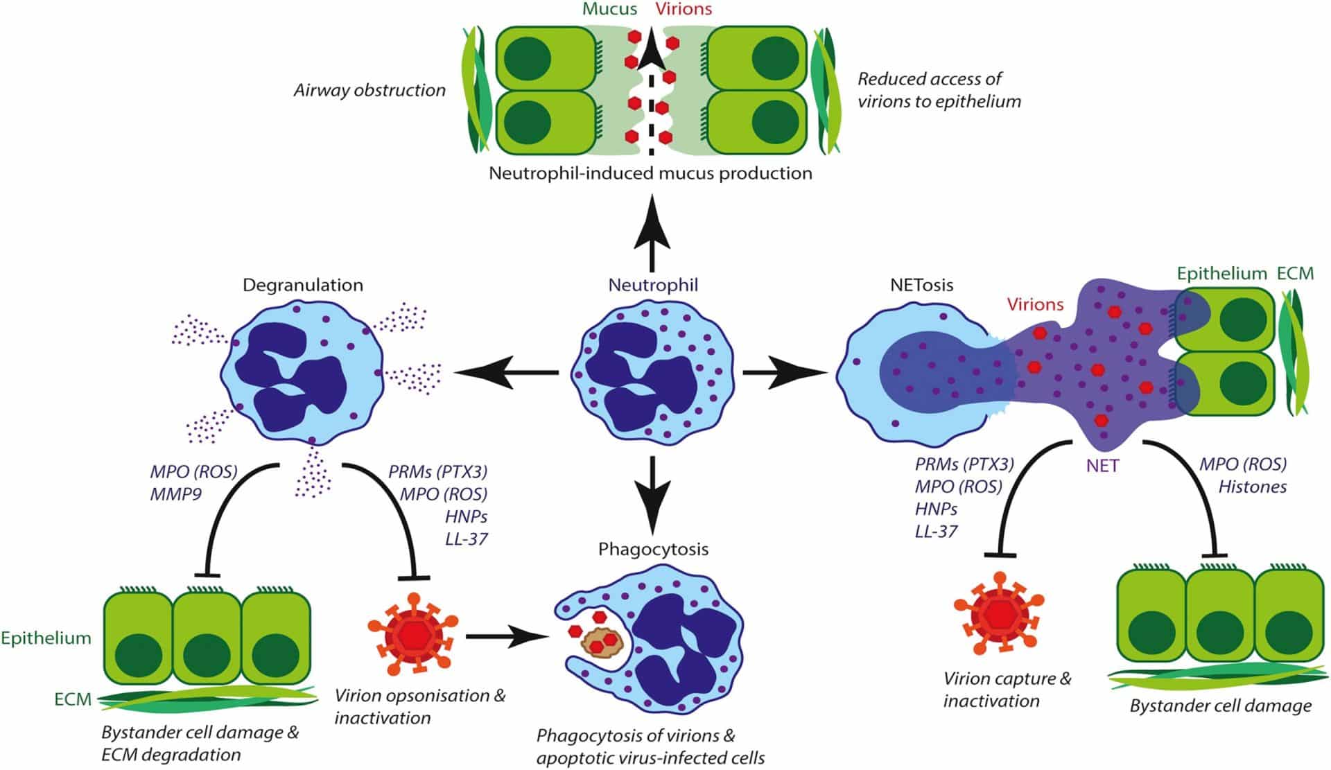 Phagocytosis of viral particles and virus-infected cells limits viral spread. Neutrophil extracellular traps capture and deactivate viral particles and damage healthy cells. When the viral cytotoxicity and the host’s cytotoxic response combine to cause the necrosis of respiratory epithelial cells, the host’s inflammatory immune reaction is triggered, including both humoral and cytotoxic T-cell activation.