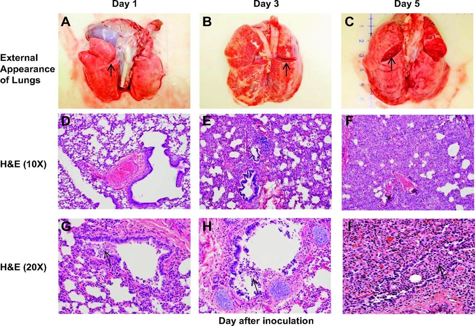 D–F demonstrate interstitial pneumonia with worsening inflammation, epithelial damage, and consolidation over time. The inflammatory infiltrate is more subtle on day 1 and found primarily in a peribronchiolar distribution with multifocal infiltration in the bronchiolar epithelium.