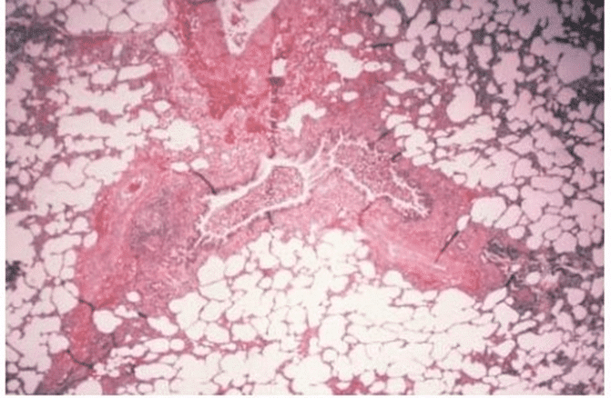 Bronchiolitis in an infant with RSV Infection. Lymphocytes infiltrate the bronchiole, and sloughed necrotic material fills and obstructs the bronchiolar lumen. The beginning of the regeneration of bronchiolar epithelium is evident