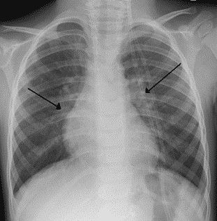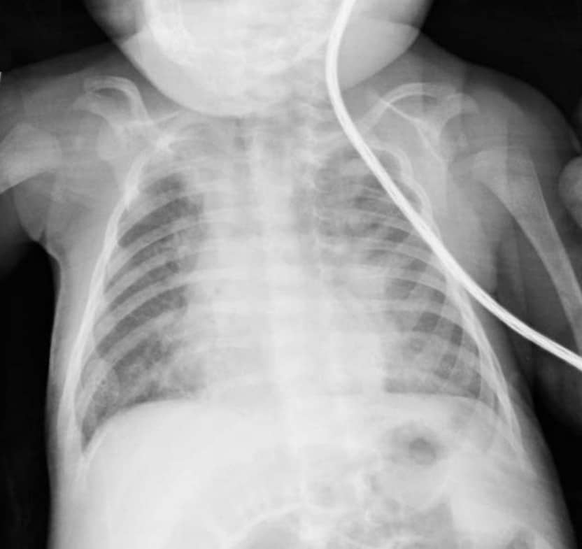 X-ray of a child with RSV showing the typical bilateral perihilar fullness of bronchiolitis