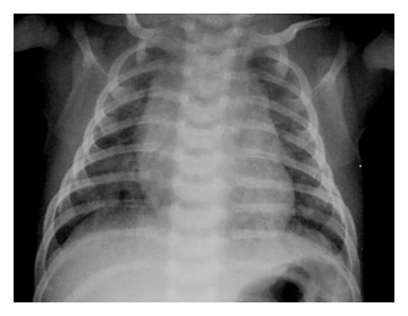 Chest radiograph of an infant showing bilateral pulmonary hyperinflation in RSV